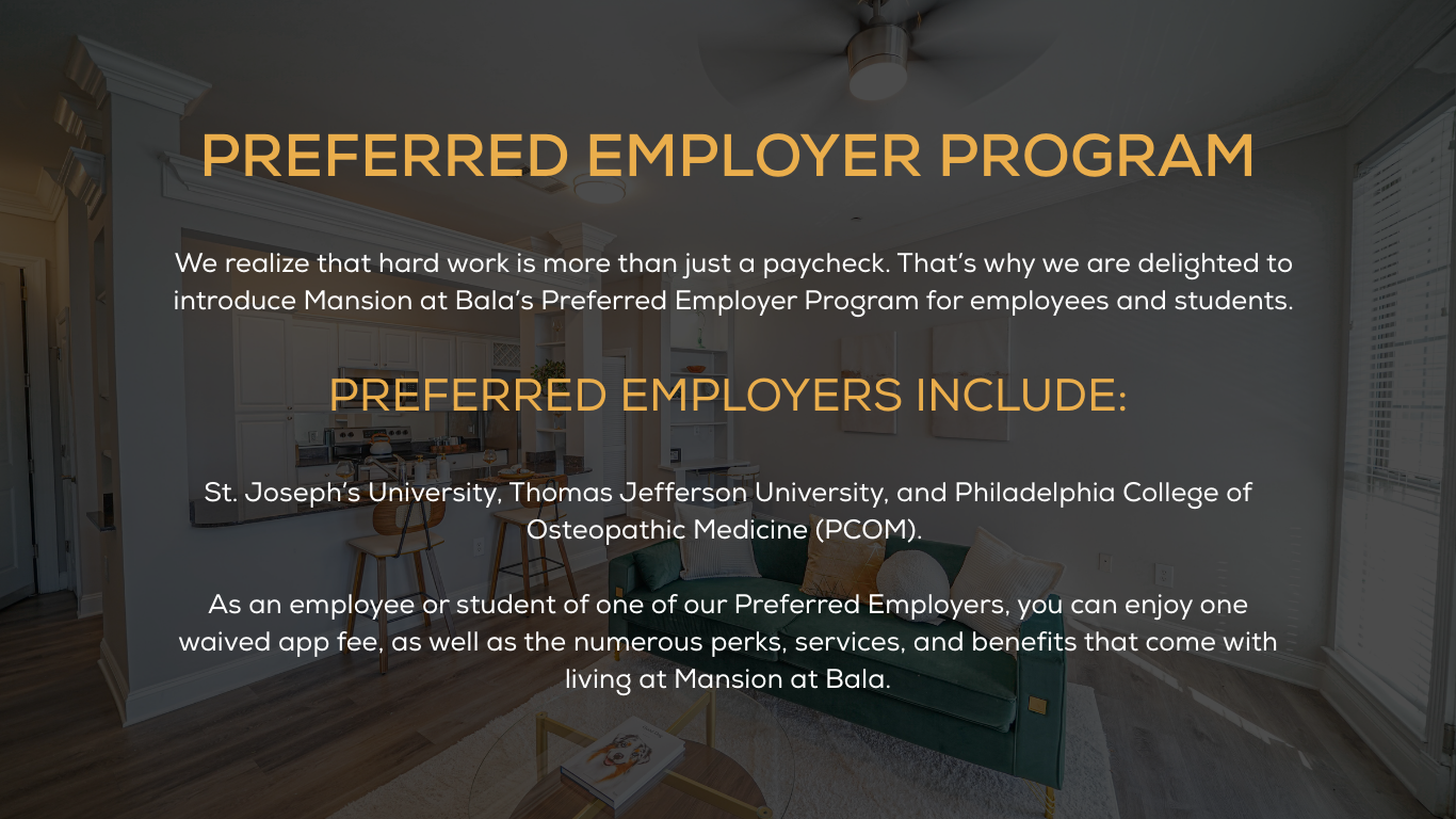 Mansion at Bala is an oasis located in the exclusive Bala Cynwyd/City Avenue district of Philadelphia, and only a few blocks from the renowned Fairmount Park. Nestled between Center City and the Main Line, Mansion at Bala offers apartment living with convenient access to all Philadelphia has to offer. Location across the street from the Bala train station (SEPTA R6), it’s never been easier to get into, or out of, downtown Philly.